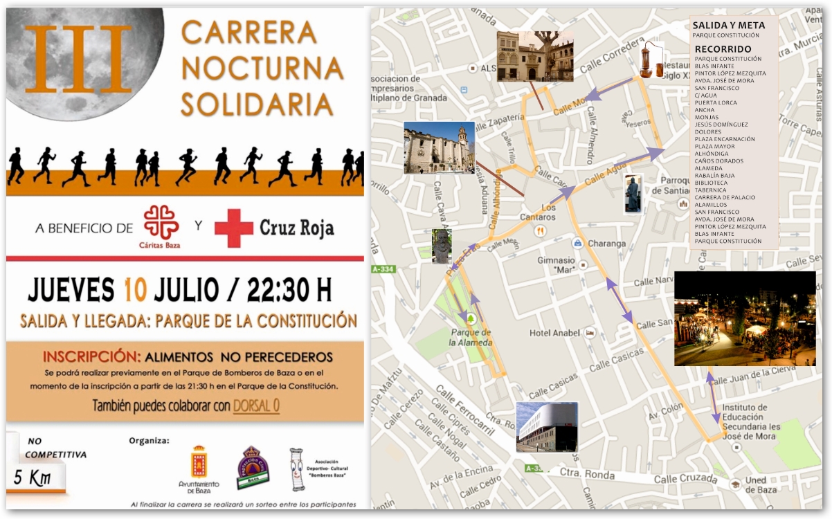 Comenzará a las 22.30 horas y para participar es necesario entregar alimentos no perecederos o productos de higiene personal desde una hora antes del inicio de esta prueba no competitiva o en el Parque de Bomberos de Baza. Se ha previsto, además, dorsales 0 para todas las personas que quieran colaborar con Cruz Roja y Cáritas Baza, pero no deseen correr los 5 kilómetros.