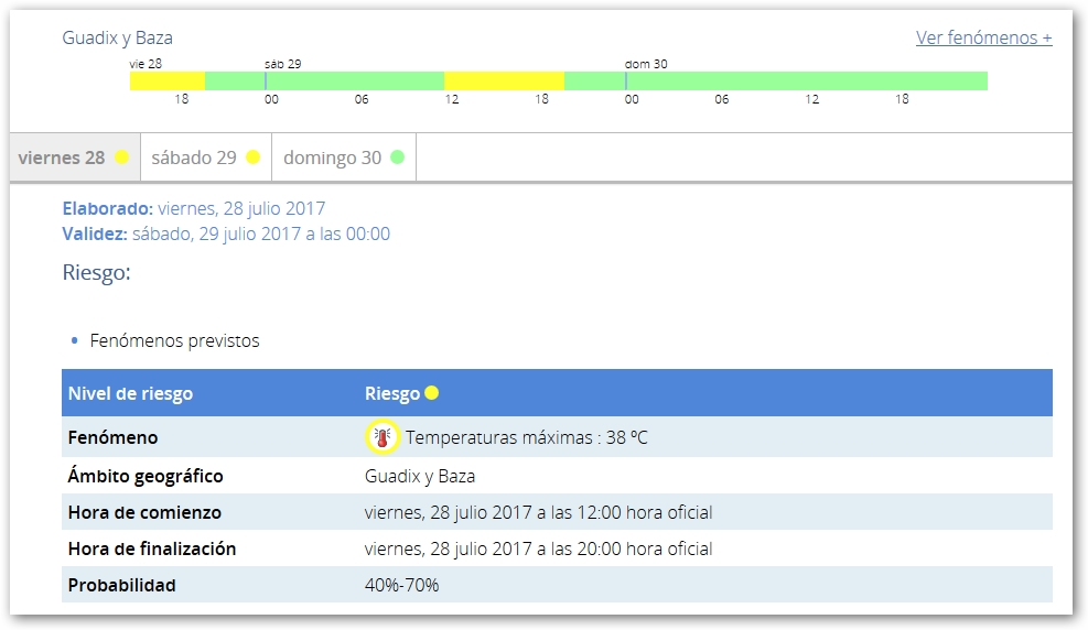 La Agencia Estatal de Meteorología informa de aviso de nivel amarillo ante altas temperaturas durante el viernes 28 y el sábado 29 de julio en el horario de 12:00 a 18:00 horas, cuando se podrán alcanzar los 38º C en las comarcas de Guadix y Baza.