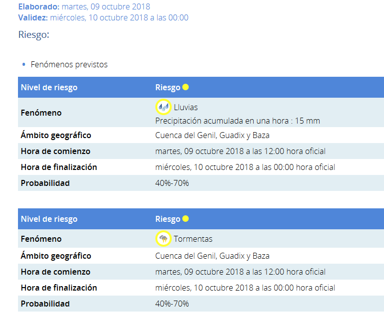 La AEMET informa que a partir de las doce del medio día de hoy, hasta las doce de esta noche, mantendrá activado el Nivel de Alerta Amarilla por lluvias y tormentas en el ámbito geográfico de la Cuenca del Genil, Guadix, Baza, Nevada y la Alpujarra.