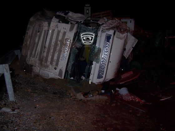 Anoche, pocos minutos después de la 1 y media de la madrugada, se produjo una colisión entre dos camiones en la A-92N, entre la primera salida de Baza y la salida hacia Cuevas del Campo, aproximadamente en el pk-38 sentido Murcia. Uno de los camiones quedó volcado en la mediana de la autovía, quedando atrapado el conductor en su interior.