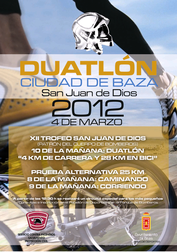 Con motivo de la Festividad de San Juan de Dios, Patrón del Cuerpo de Bomberos y de Enfermería, este Servicio quiere invitaros a la tradicional Duatlón que se celebrará este Domingo 4 de Marzo.