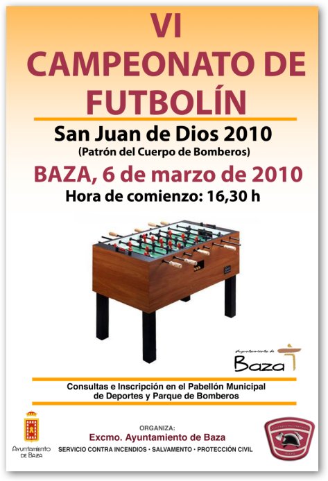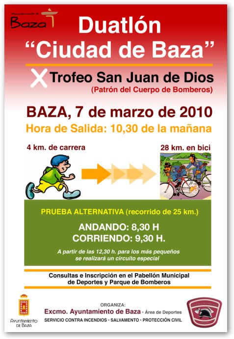 Como todos los años, queremos compartir la Festividad del Patrón de Bomberos, San Juan de Dios, con todos vosotr@s, así que os invitamos a que reservéis el fin de semana que viene, 6 y 7 de Marzo para participar en la VI Edición de Futbolín, y la X Edición de la Duatlón «Ciudad de Baza», en la que también se puede participar realizando el recorrido íntegro andando o corriendo.