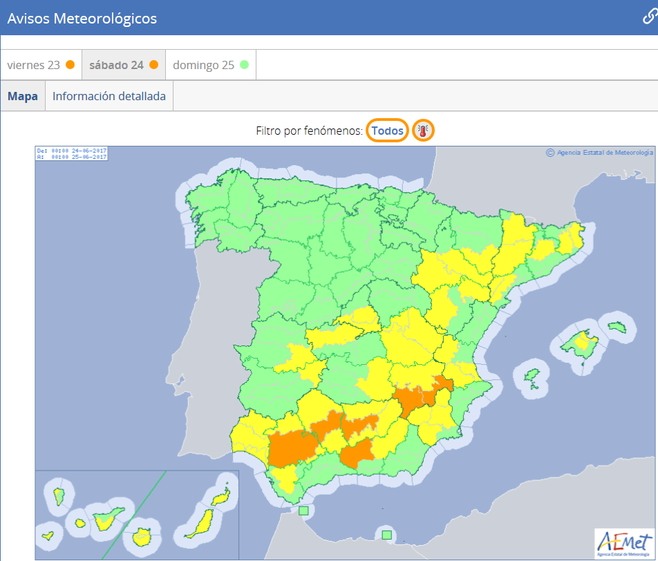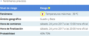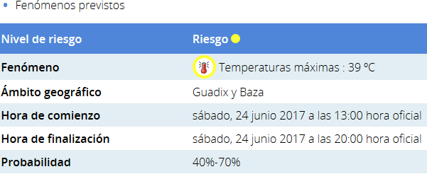 Mañana sábado, 24 de junio la Agencia Estatal de Meteorología ha decretado el aviso de riesgo amarillo por altas temperaturas en el ámbito geográfico de Guadix y Baza por temperaturas que pueden alcanzar los 39ºC.