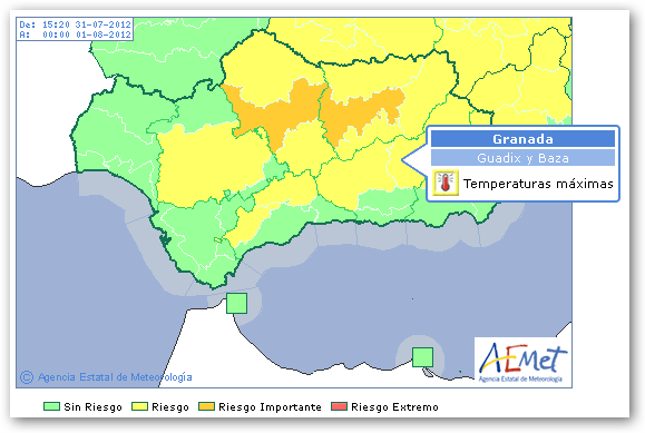 La Agencia Estatal de Meteorología ha decretado Nivel de Alerta Amarilla por altas temperaturas en la Cuenca del Genil, Guadix y Baza, con una previsión de temperaturas máximas que podrán alcanzar los 38ºC.