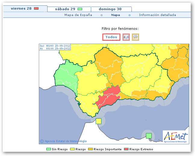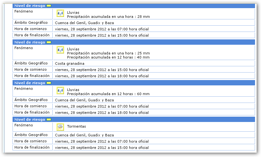 La Agencia Estatal de Meteorología ha activado el nivel de alerta naranja, para la jornada de hoy viernes, 28 de septiembre, ante el riesgo de lluvias y tormentas en el ámbito geográfico de la cuenca del Genil, Guadix y Baza. La previsión de precipitación es de 45mm. a la hora; pudiendose acular hasta 80mm. en 12 horas.