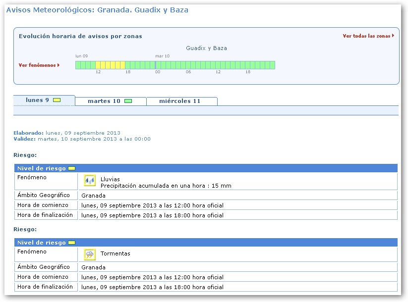 La AEMET ha decretado el nivel de alerta amarillo por lluvias y tormentas en el ámbito geográfico de Guadix y Baza desde las 12 del mediodía hasta las 6 de la tarde. Pudiéndose alcanzar hasta 15 mm de precipitación en un hora.