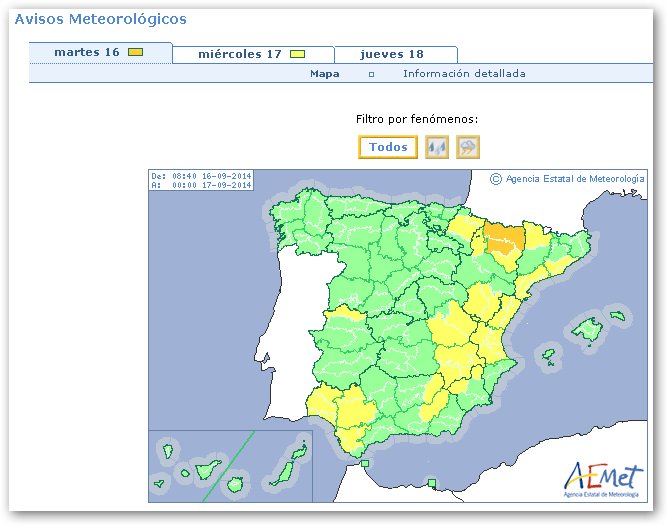 La alerta permanecerá activada desde las doce del mediodía hasta las ocho de la tarde de hoy martes, 16 de septiembre. Se prevee que puedan caer hasata 15 mm. de precipitación en una hora con una probabilidad de tormentas del 40% al 70%.