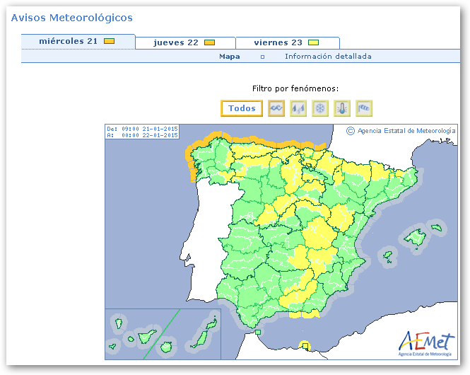 La alerta permanecerá activada desde las tres de esta tarde hasta las doce de la noche de mañana, día 22 de enero. La probabilidad es del 40% al 70% y la cota se situa en torno a los 700-800 metros.