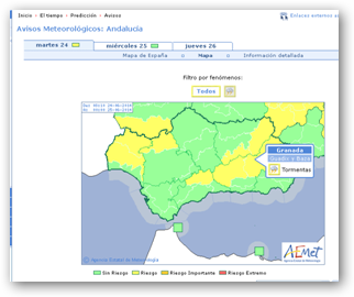 La AEMET ha activado el nivel de alerta amarillo por tormentas en la Cuenca del Genil, Guadix y Baza. Dará comienzo a partir de las doce del medio y se prolongará hasta las ocho de la tarde de hoy martes 24 de junio.