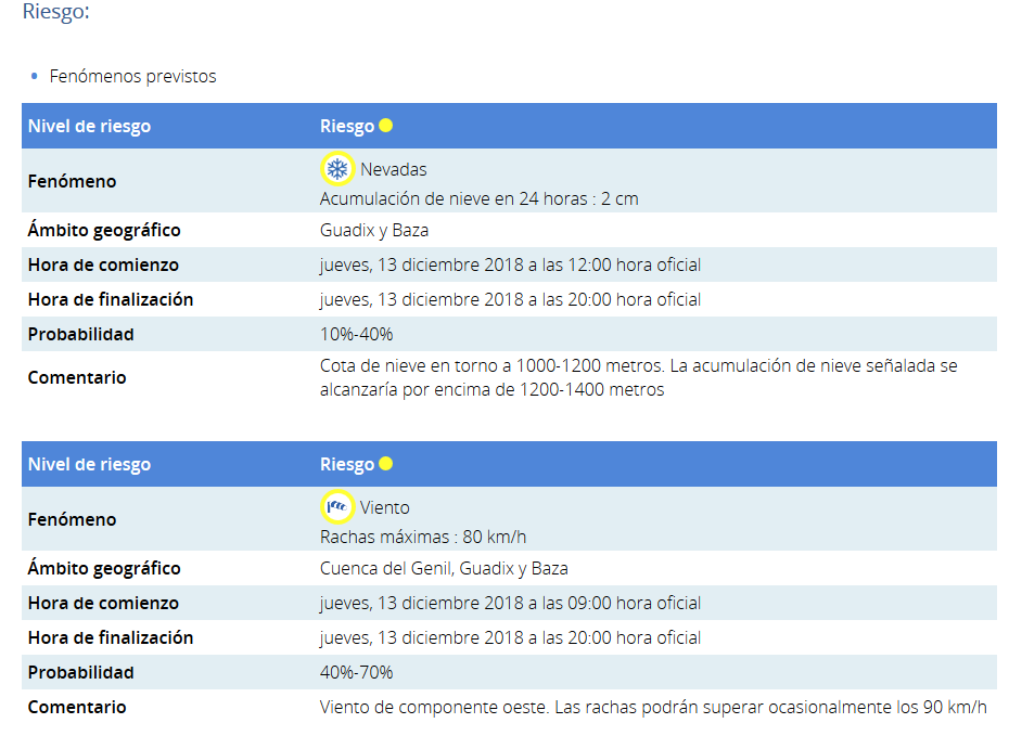 La AEMET mantendrá activado el nivel de aviso amarillo por viento y nieve, de nueve de la mañana a ocho de la tarde en ámbito geográfico de la Cuenca del Genil, Guadix y Baza.