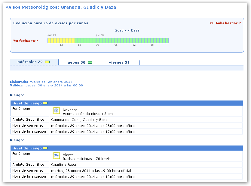 La AEMET ha decretado el nivel de alerta amarillo por viento y nieve en el ámbito geográfico de Guadix y Baza. La alerta por viento permanecerá activada hasta las doce del medio día por rachas de viento que pueden alcanzar los 70 km/h. El aviso por nieve se mantendrá desde las ocho de la mañana hasta las cinco de la tarde, con una previsión de acumulación de 2 cm de nieve.