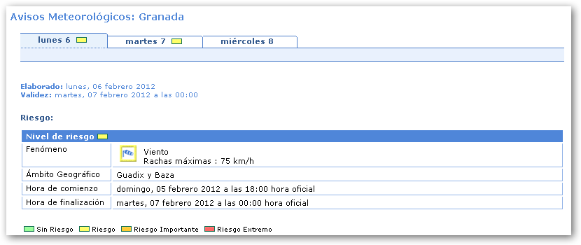 La Agencia Estatal de Meteorología ha decretado Alerta amarilla por viento en las Comarcas de Guadix y Baza con rachas de viento que pueden alcanzar los 75 km/h., desde las 18’00 horas del domingo 05 de febrero hasta las 17’00 horas del martes 07 de febrero.