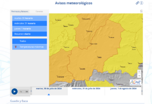 La AEMET informa que mantendrá activado el nivel de aviso naranja en el ámbito geográfico de Guadix y Baza los días 30, 31 de julio y 01 de agosto, desde las 13’00h. hasta las 21’00h. por temperaturas que podrán alcanzar los 42ºC., con una probabilidad del 40% – 70%.
