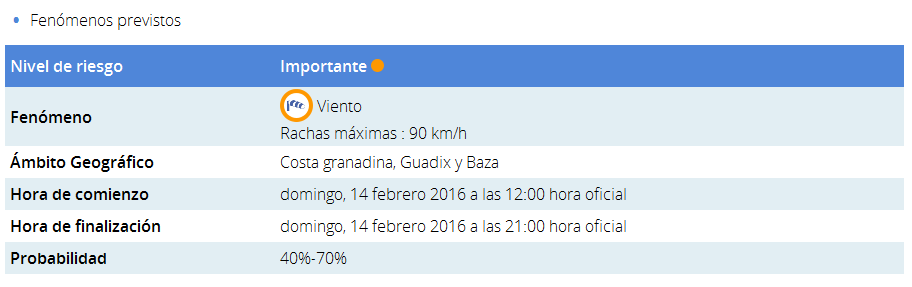La Agencia Estatal de Meteorología ha aumentado a nivel naranja el riesgo por fuertes viento para la jornada del domingo 14 de febrero, con rachas máximas que podrán alcanzar los 90 km/h, en la costa granadina, Guadix y Baza.