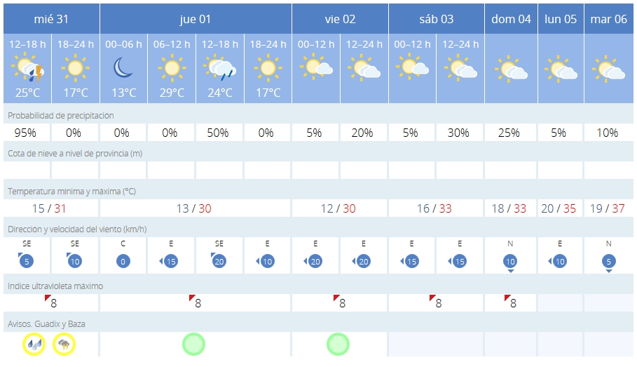 La Agencia Estatal de Meteorología ha emitido un boletín de aviso meteorológico con nivel amarillo para Guadix y Baza, con una probabilidad del 40 al 70% de lluvias y tormentas con unas precipitaciones que pueden alcanzar los 15 mm en una hora, aviso que permanecera activo hasta las 21:00 horas.