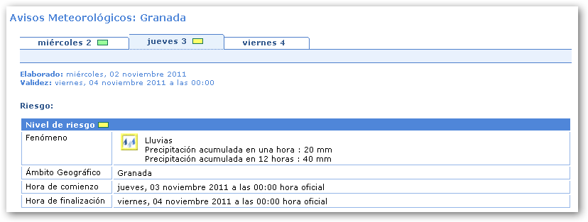 La Agencia Estatal de Meteorología informa que a partir de las 00’00 horas del 03 de noviembre de 2011 se activa el nivel de alerta amarillo en la la provincia de Granada, ante el riesgo de fuertes lluvias. La alerta permanece activada hasta las 00’00 horas del 04 de noviembre de 2011.