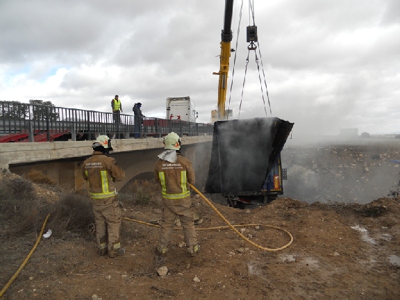 El camión, que circulaba sentido Murcia, ha caído en una vaguada de la rambla que pasa bajo un puente a pocos kilómetros de Almaciles. La colisión ha provocado un incendio en la totalidad del tráiler que transportaba cableado para montaje de vehículos.