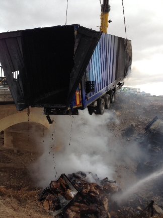 Las complicadas tareas de liberación y extinción se han prolongado durante 16 horas debido a la ubicación del camión a más de 10 metros de desnivel, cuyo contenido era combustible y muy tóxico y que ha requerido la participación de una retroexcavadora para la extracción de toda la carga del remolque.