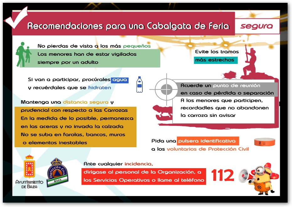 En el punto de salida, los voluntari@s de Protección Civil dispondrán de pulseras identificativas para los más pequeños que participen en las Carrozas y en colaboración con Policía Local cubrirán el dispositivo de tráfico necesario para reservar las vía pública a este evento.