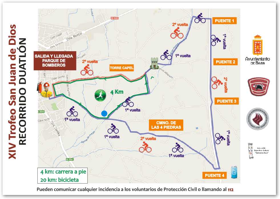 Debido a la precipitaciones durante la jornada de hoy sábado y las previsiones para mañana, se modifica el recorrido de la Duatlón y de las pruebas alternativas corriendo y andando, realizando un circuito por asfalto y menor kilometraje que el previsto.