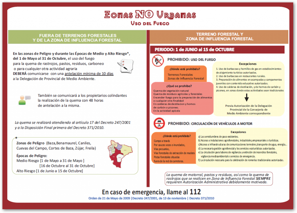 Además, desde el 1 de Mayo, el uso del fuego para la quema de rastrojos, pastos, residuos, carboneo o para cualquier otra actividad agraria FUERA DEL TERRENO FORESTAL DEBE comunicarse con una antelación de 10 días a la Delegación Provincial de Medio Ambiente.