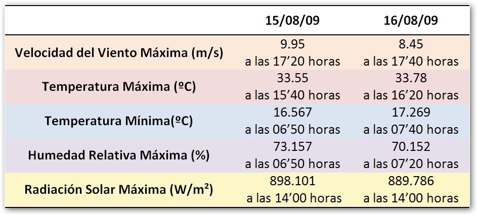 Tabla comparativa de los datos obtenidos de la estación meteorológica del Parque de Bomberos de Baza durante este fin de semana:
