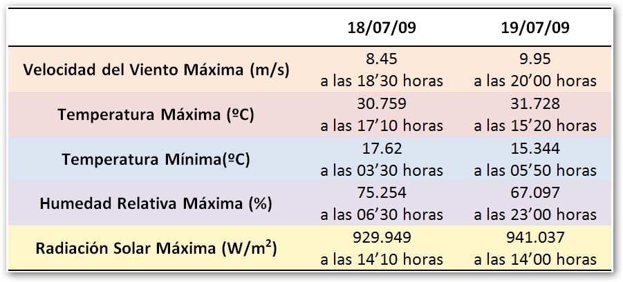 Tabla comparativa de los datos obtenidos de la estación meteorológica del Parque de Bomberos de Baza durante este fin de semana: