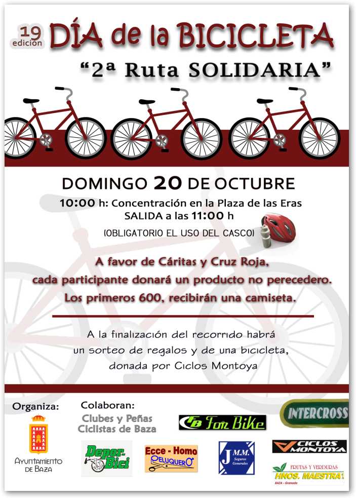 El domingo día 20 de octubre la ciudad de Baza celebrará el Día de la Bicicleta con un recorrido urbano que tendrá un fin solidario, recaudar alimentos y productos de higiene personal y doméstica para las familias que son beneficiarias de las atenciones de Cruz Roja Española y Cáritas Baza.