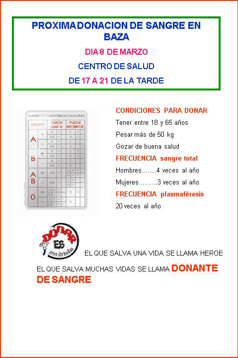 El Centro Regional de Transfusión Sanguínea de Granada en colaboración con la Asociación de Donantes de Sangre Altruistas de Granada, con el lema «Tienes Corazón de Sobra» hace un llamamiento URGENTE a todos los bastetanos para que donen sangre. Será posible el Lunes 8 de Marzo en el Centro de Salud de Baza, en horario de 17 a 21 horas.