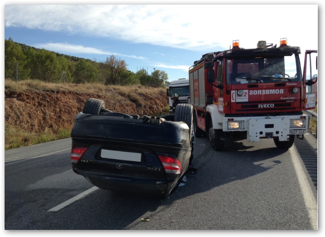 Una dotación de bomberos movilizados con un furgón de Salvamento y un vehículo contra incendios han acudido hasta el kilómetro 26 donde se situaba el citado accidente en sentido Murcia. Un turismo en posición invertida se había precipitado desde la vía de servicio paralela a la autovía cayendo en el carril izquierdo de circulación. Los dos ocupantes del vehículo han podido salir sin necesidad de ser liberados del interior del vehículo que afortunadamente no ha generado más incidentes en la vía. Los Servicios Sanitarios han trasladado a esta pareja al Hospital General Básico de Baza con diversos traumatismos y heridas.