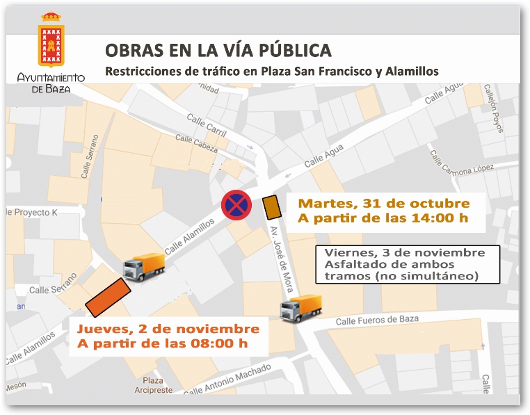 El asfaltado de ambos tramos se realizará el viernes día 3 de noviembre por lo que también será necesario el corte de ambas vías, tanto del acceso de José de Mora como de la calle Alamillos.