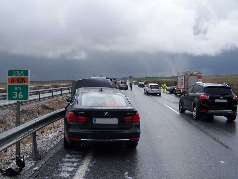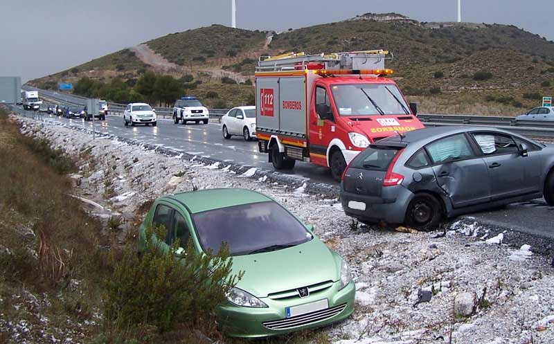 Uno de los accidentes involucró a cuatro vehículos que quedaron obstaculizando la vía sentido Murcia tras varios alcances y, posiblemente a consecuencia de las inclemencias meteorólogicas que condensaron en un breve espacio de tiempo una gran granizada. Ningún ocupante quedó atrapado en el interior de su vehículo ni sufrió heridas graves. A tan sólo un kilómetro de distancia, otro accidente de tráfico con dos turismos. La conductora de uno de ellos fue trasladada por los Servicios Sanitarios al Hospital de Baza.