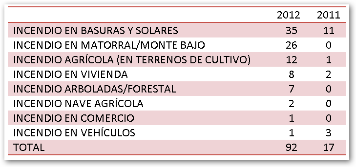 La tipología que más ha incrementado esta cantidad son los incendios, que representan el 47% de las actuaciones de los bomberos en este primer trimestre, extinguiendo 75 incendios más que en el mismo periodo de 2011, en concreto se suman ya 92 incendios en comparación con 17 incendios el año pasado en tal fecha como hoy.