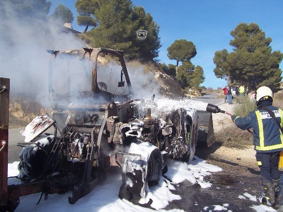 La extinción de las llamas del vehículo agrícola en la pedanía de La Teja llevó más de tres horas, desde las 11.33 que se produjo el aviso hasta las 14.31, y se vieron dificultadas por el aceite hidráulico del tractor, que transportaba aceitunas. En las labores de extinción participó una dotación de bomberos con un vehículo bomba urbana ligera.
