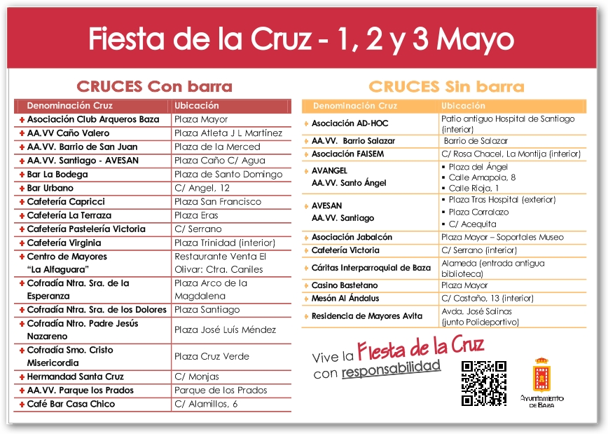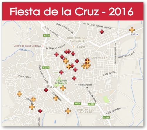 Las cruces autorizadas, con barra y sin barra, se reparten por toda la ciudad desde el barrio de Las Cuevas al centro histórico, pasando por zonas residenciales como el Parque de los Prados o la Montija, y centros asistenciales como la residencia y unidad de estancia diurna municipal y los colectivos Ad- Hoc, Faisem y Jabalcón. Serán visitables al público entre los días 1 y 3 de mayo, si bien este último no podrá exceder de las doce de la noche.