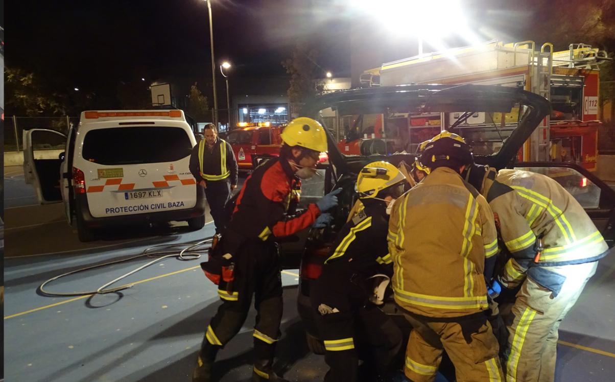Personal del Parque de Bomberos de Baza, bomberos de la Agencia Provincial de Extinción de incendios, Policías Locales de Baza, Técnicos en Emergencias Sanitarias y voluntarios de Protección Civil asistieron a esta actividad formativa que culminó con un simulacro en el Parque de la Constitución donde se simuló una colisión entre dos vehículos cuyos ocupantes eran dos conductores y dos menores, respectivamente, con sistemas de retención infantil diferentes. En la planificación y ejecución de este ejercicio práctico, colaboró la Asociación de Rescate y Emergencias (A.R.T.E.).