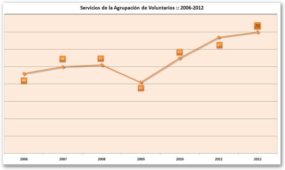 El informe de actuaciones elaborado por Protección Civil pone de manifiesto que se obtiene un promedio de asistencia de 9 servicios al año por voluntario, si bien la implicación de los 50 voluntarios es dispar, con voluntarios que llegan a estar presentes en el 70% de las actividades y otros que dedican menos tiempo.