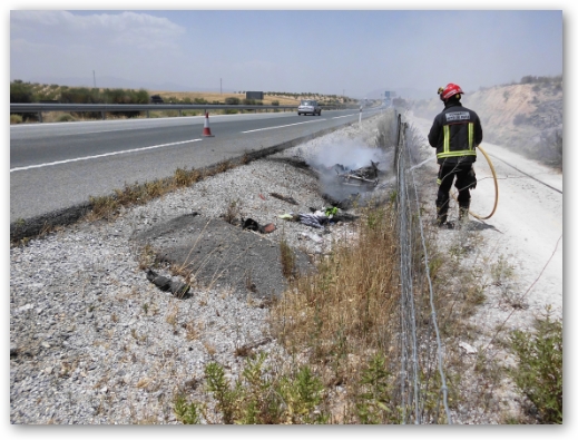 El conductor presentaba heridas de diversa consideración y ha sido desplazado al Hospital General Básico de Baza. Tras el accidente, su motocicleta se ha incendiado propagándose el incendio desde la cuneta hasta las inmediaciones, siendo necesaria la intervención de una dotación del Parque Bastetano que ha extinguido una hectárea de terrenos de cultivo de esparto y trigo.