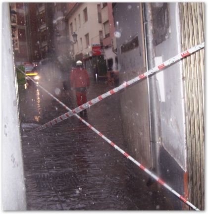 Además, el callejón Serrano ha permanecido balizado esta mañana a consecuencia de un desprendimiento de una vivienda. Los bomberos utilizando la Escala han accedido hasta la moldura exterior de la vivienda, saneando y asegurando el paso de peatones nuevamente.