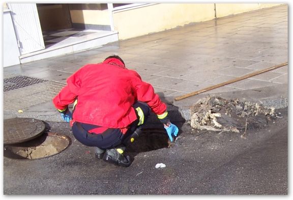A media mañana y a consecuencia de la lluvia, una arqueta en la C/ Cádiz frente al Parque de la Constitución se había atrancado. Los bomberos han extraído todo el material que la mantenía atorada.