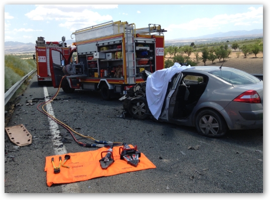 Dos dotaciones del Servicio contra Incendios, Salvamento y Protección Civil del Ayuntamiento de Baza han participado hoy en el rescate de tres personas fallecidas, aunque una de ellas se encontraba aún con vida cuando fue rescatada del vehículo, a consecuencia de un accidente se trafico.