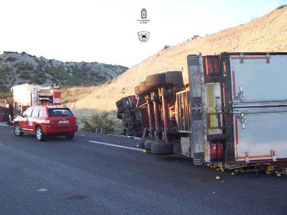 Esta mañana, pocos minutos después de las seis, el Centro de Coordinación iniciaba la movilización de los distintos operativos que actuarían en el accidente de un camión que estaba volcado en el kilómetro 51.8 de la A-92N sentido Murcia, cerca de la salida hacia Salazar. El camión transportaba cajas de limones, que tras el accidente esta mercancía ha quedado esparcida por la vía y la cuneta.