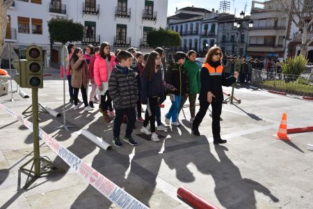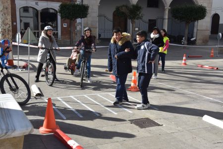A continuación, se ha desarrollado la clase práctica en la Plaza Mayor, que ha quedado convertida en un circuito con señales de tráfico verticales y horizontales, semáforos, carreteras y acerado. Los estudiantes han interpretado diferentes roles, enfrentándose a situaciones habituales y posibles, tales como la conducción de vehículos (bicicletas), el paso de peatones por pasos de peatones o sin ellos y qué hacer si presencian un accidente con víctimas.