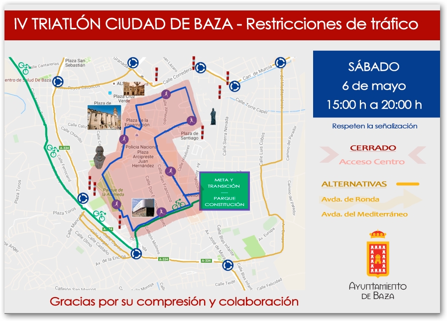 El sábado día 6 de mayo nuestra ciudad celebra la tercera edición del Triatlón Cross Ciudad de Baza, una cita deportiva que atraerá a cientos de participantes. Te dejamos los recorridos y planos para que disfrutes de este evento y, si conduces, tengas en cuenta las restricciones de tráfico.