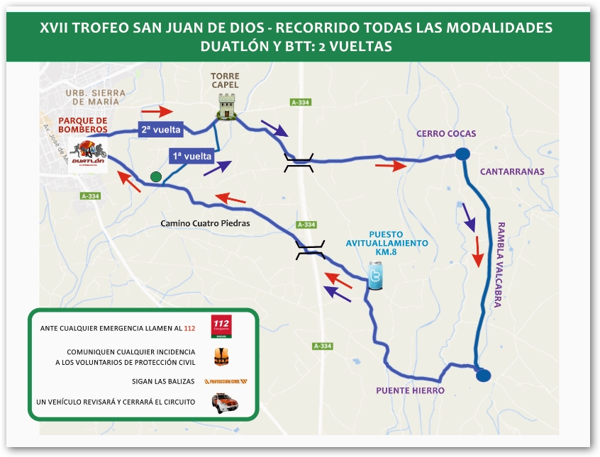 A consecuencia de la lluvia, el estado de los caminos del recorrido tradicional del XVII Trofeo San Juan de Dios ha quedado intransitable, por lo que la Organización de la Asociación Deportivo Cultural Bomberos Baza ha decidido modificar el recorrido de todas las modalidades, que van a compartir el mismo circuito, manteniendo la diferencia horaria entre las pruebas y con la excepción para Duatlón y BTT que deberán realizar dos vueltas al mismo recorrido.
