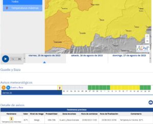 La AEMET informa que mantendrá activado el nivel de aviso amarillo por temperaturas máximas que podrían alcanzar los 39ºC en Guadix-Baza-Granada. La alerta permanecerá activada desde la una del medio día hasta las nueve de la noche de los días 25 y 26 de agosto.