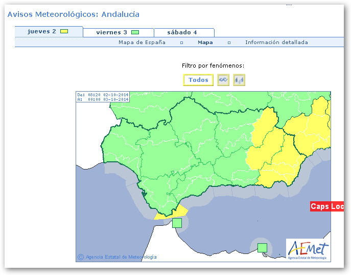 La alerta dará comienzo a partir de las doce del mediodía y se prolongará hasta las ocho de la noche de de hoy jueves 02 de octubre, con una previsión de precipitación de 15mm/ hora.