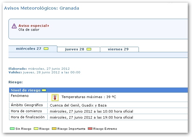Una jornada más la Agencia Estatal de Meteorología activa el nivel de alerta amarillo en la Cuenca del Genil, Guadix y Baza ante una ola de calor, por temperaturas que pueden ascender hasta los 39ºC.