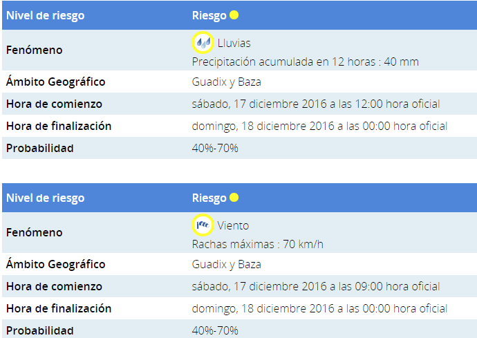 Desde las 05:00h del 17/12/2016 hasta las 00:00h del 18/12/2016, se activarán nuevas alertas por viento, lluvia y nieve.