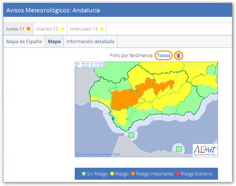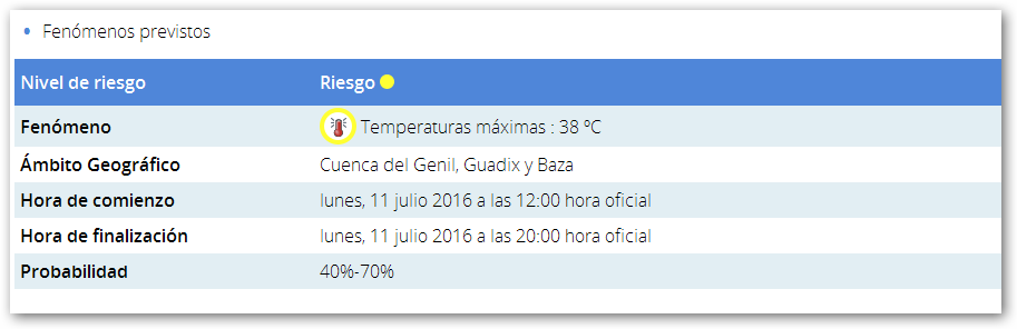La AEMET mantendrá activado el aviso amarillo ante el riesgo por altas temperaturas en la Cuenca del Genil, Guadix y Baza durante la jornada de hoy lunes 11 de julio.